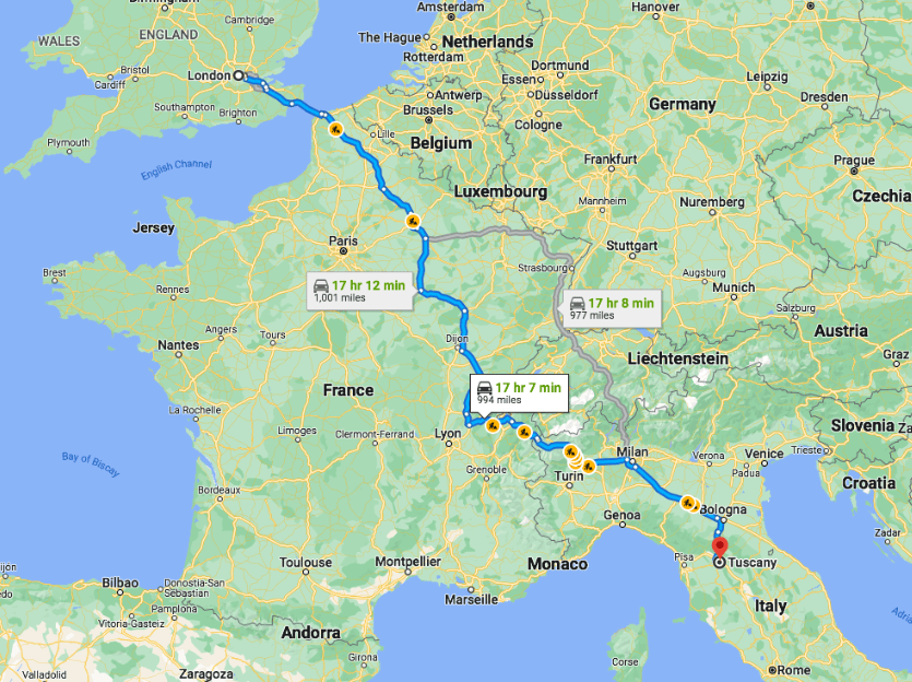 My extended family are meeting up in central Italy this summer. “Aha,” I thought, “let’s see if we can avoid flying. It might be a challenge with a small child, but what a great way to see Europe,” and, I modestly said to myself, “And what an example we’ll set!”